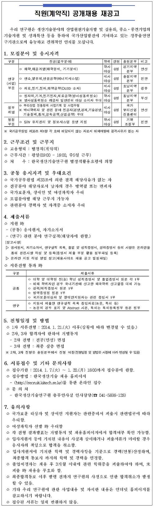 2014³â Çѱ¹»ý»ê±â¼ú¿¬±¸¿ø Á÷¿ø(°è¾àÁ÷) °ø°³Ã¤¿ë