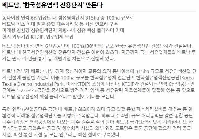 º£Æ®³² Á¤ºÎ°¡ º£Æ®³² ³²ºÎ °æÁ¦ Áß½ÉÁöÀÌÀÚ ±³ÅëÀÇ ¿äÁö µ¿³ªÀ̼º¿¡ 315ha ±Ô¸ð·Î ¼¶À¯¿°»ö»ê¾÷ ´ÜÁö °Ç¼³¿¡ µ¹ÀÔÇÑ °¡¿îµ¥ ÀÌÁß 100ha ±Ô¸ð¸¦ Çѱ¹¼¶À¯¾÷ü Àü¹®´ÜÁö Çѱ¹¼¶À¯¿°»ö»ê¾÷°ø´Ü(Korea Textile Dyeing Industrial Park, ÀÌÇÏ KTDIP) Á¶¼º¿¡ ³ª¼±´Ù. KTDIP°¡ °Ç¼³µÇ´Â ¿¬Â¦ 6»ê¾÷°ø´Ü Àαٿ¡´Â 1¡¤2¡¤3¡¤4¡¤5 °ø´ÜÀ» Áß½ÉÀ¸·Î ¹æÀû Á¦Á÷ ¿°»ö µî ¼¶À¯°ü·Ã Á¦Á¶¾÷üµéÀÌ ¹ÐÁýÇØ ÀÖ´Â µî ¾ÕÀ¸·Î º£Æ®³² ¼¶À¯»ê¾÷ÀÇ ÇÙ½É Å¬·¯½ºÅÍ·Î ¹ßÀü¿¡ ±â´ë¸¦ ¸ðÀº´Ù.