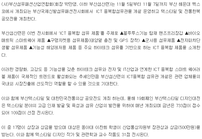 (»ç)ºÎ»ê¼¶À¯ÆÐ¼Ç»ê¾÷¿¬ÇÕȸ(ȸÀå ¹Ú¸¸¿µ, ÀÌÇÏ ºÎ»ê¼¶»ê·Ã)´Â 11¿ù 5ÀϺÎÅÍ 11¿ù 7ÀϱîÁö ºÎ»ê ÇØ¿î´ë º¤½ºÄÚ¿¡¼ °³ÃֵǴ ºÎ»ê±¹Á¦½Å¹ß¼¶À¯ÆÐ¼ÇÀü½Ãȸ¿¡¼ ICT À¶º¹ÇÕ¼¶À¯°üÀ» °³¼³ ¿î¿µÇϰí ÅØ½ºÅ¸ÀÏ ¹× ÀüÅëÇѺ¹ °ø¸ðÀüÀ» °³ÃÖÇÑ´Ù. ºÎ»ê¼¶»ê·ÃÀº À̹ø Àü½Ãȸ¿¡¼ ¡®ICT À¶º¹ÇÕ ¼¶À¯ Á¦Ç°¡¯¸¦ ÁÖÁ¦·Î ¡ãºí·çÅõ½º±â´É žÀç ÇÚÁîÇÁ¸®Àå°© ¡ã¹ÙÀÌ¿À¸ÅÆ®¸¯ ½º¸¶Æ®¿þ¾î Á¦Ç° ¡ã±¸¸íÀÚÄÏ¿ë ¼¶À¯Á¦Ç°(ÅÂ¾ç¿ ÃæÀü ¹× GPS ÀåÂø) ¡ã±º»ç¿ë ¼¶À¯Á¦Ç° ¡ãÀüÀÚÆÄÂ÷´Ü »ýȰ ¼¶À¯Á¦Ç° ¡ã±â´É¼º ÇØ¾ç·¹Àú¿ë Á¦Ç° µî ÁÖ¿ä ÇÏÀÌÅ×Å© ¼¶À¯¸¦ ±â¹ÝÀ¸·Î ÇÏ´Â ICT À¶º¹ÇÕ Á¦Ç°À» ¼Ò°³ÇÑ´Ù. ÀÌ·¯ÇÑ °æ·®È, °í°µµ µî ±â´É¼ºÀ» °®Ãá ÇÏÀÌÅ×Å© ¼¶À¯¿Í ÀüÀÚ ¹× IT»ê¾÷°ú ¿¬°èÇÑ ICT À¶º¹ÇÕ ½º¸¶Æ® ¿þ¾î·¯ºí Á¦Ç°ÀÌ ±¹Á¦ÀûÀÎ Æ®·»µå·Î Ȱ¼ºÈµÇ´Â Ãß¼¼Àθ¸Å ºÎ»ê¼¶»ê·ÃÀÇ ICTÀ¶º¹ÇÕ ¼¶À¯°ü °³¼³Àº °ü·Ã ¾÷üµéÀÇ ±¹³»¿Ü ½ÃÀåÁøÃâ¿¡ ¼±µµÀûÀÎ ¿ªÇÒÀ» ÇÒ ¼ö ÀÖÀ» °ÍÀ¸·Î ±â´ëÇÑ´Ù. ÀÌ¿Í ÇÔ²² ºÎ»êÅØ½ºÅ¸ÀÏ ¹× ´ëÇѹα¹ÀüÅëÀÇ»ó °ø¸ðÀüµµ °³ÃÖ Çϴµ¥, ¿ÃÇØ 19ȸ°ÀÎ ºÎ»êÅØ½ºÅ¸ÀÏ µðÀÚÀδëÀüÀº ÅØ½ºÅ¸ÀÏ ºÐ¾ßÀÇ °í±Þ ÀÎÀç ¹ß±¼ ¹× À°¼º°ú ¼¶À¯ »ê¾÷ÀÇ ¹ßÀüÀ» À§ÇÏ¿© ¸Å³â °³ÃÖµÇ¸ç ±Ý³âÀº 733Á¡ÀÌ Á¢¼öµÇ¾î 109Á¡ÀÌ ¼±Á¤ Àü½ÃµÈ´Ù. ÀÌ Áß 17¸íÀÌ »óÀå°ú »ó±ÝÀ» ¹ÞÀ¸¸ç ´ë»óÀº µ¿¾Æ´ë ÀÌÂùÈñ ÇлýÀÌ »ê¾÷Åë»óÀÚ¿øºÎ Àå°ü»ó°ú »ó±Ý(500¸¸¿ø)À» ¹Þ´Â´Ù. ÀÌ¿Í ÇÔ²² ÅØ½ºÅ¸ÀÏ µðÀÚÀÎ ÀÛ°¡ ¹× °ü·ÃÇаú ±³¼ö ÀÛǰµµ 31Á¡ Àü½ÃµÈ´Ù. ¶ÇÇÑ, ±¹³» ÀüÅ뺹½ÄÀÇ ±Û·Î¹úÈ¿¡ ±â¿©Çϱâ À§ÇØ °³ÃֵǴ ´ëÇѹα¹ÀüÅëÀÇ»ó °ø¸ð´ëÁ¦ÀüÀº ¿ÃÇØ 16ȸ°·Î 120¿©Á¡ÀÇ ½Ç¹° ÀÛǰÀÌ Á¢¼ö µÆ´Ù. Àü½Ã±â°£ Áß ½É»ç¸¦ ÅëÇØ ´ë»ó(»ê¾÷Åë»óÀÚ¿øºÎÀå°ü, »ó±Ý 300¸¸¿ø)µî 10Á¡À» ½É»ç¸¦ ÅëÇØ ¼±Á¤ÇÏ°Ô µÈ´Ù. ƯÈ÷, ¼±Á¤µÈ ¿ì¼öÀÛǰÀº ÇѺ¹ÆÐ¼Ç¼î¿¡¼ ·±¿þÀÌ ¸ðµ¨µéÀÌ ÀÔ°í ÀÛ°¡¿Í ÇÔ²² ÆÐ¼Ç¼î¸¦ ÇÔÀ¸·Î ÀÛǰ¿¡ ´ëÇÑ ½ÇÁúÀû °¨°¢À» üÇèÇϰí ÀÚ±à½ÉÀ» ´À³¢°Ô µÈ´Ù. ÇÑÆí, ºÎ»ê ¹× ´ë±¸, °æºÏ¿¡ ¼ÒÀçÇϰí ÀÖ´Â ¼¶À¯ÆÐ¼Ç ¾÷ü(°æÀº»ê¾÷, °¡¹ÎÀÎÅͳ»¼Å³Î, SBÄÚÆÛ·¹ÀÌ¼Ç µî)ÀÇ Àü½Ã Âü°¡¸¦ Áö¿øÇØ, Áö¿ª °£ ¿¬°èÇù·ÂÀ» ÅëÇÑ ½ºÆ®¸² ±¸¼º ¹× °øµ¿¹ÙÀ̾î À¯Ä¡ µî ºÎ»ê¼¶À¯ÆÐ¼Ç»ê¾÷¿¬ÇÕȸ °øµ¿°ü ¿î¿µÀ» ÅëÇØ Àû±Ø È«º¸ÇÒ °èȹÀÌ´Ù. ºÎ»ê¼¶À¯ÆÐ¼Ç»ê¾÷¿¬ÇÕȸ ¼¿µ¼ö »ó±ÙºÎȸÀåÀº ¡°ºÎ»êÁö¿ªÀÇ ¼¶À¯ÆÐ¼Ç»ê¾÷ ¹ßÀü¡±À» À§ÇÏ¿© ºÎ»ê±¹Á¦½Å¹ßÆÐ¼ÇÀü½ÃȸÀÇ ¿ªÇÒÀ» È®´ëÇÏ´Â ¹æ¾ÈÀ¸·Î ¼¼°èÀûÀÎ ±¹Á¦ Àü½Ãµé°ú Çù·ÂÇØ Àü½Ãȸ °³ÃÖÇÔÀ¸·Î½á ÇØ¿Ü ±â¾÷À¯Ä¡ ¹× Áö¿ª ±â¾÷µéÀÇ ÇØ¿Ü ÁøÃâ Åä´ë¸¦ ¸¶·ÃÇØ ³ª°¡¾ß ÇÑ´Ù"°í ¸»Çß´Ù. * ÀÚ·áÃâó : tinnews ¹Ù·Î°¡±â