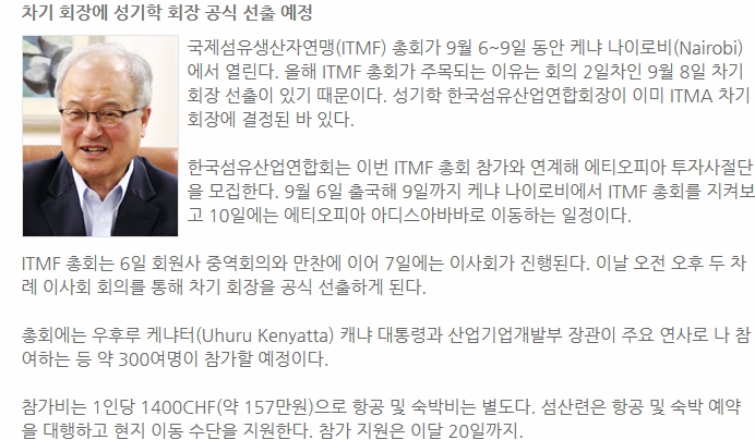 Â÷±â ȸÀå¿¡ ¼º±âÇРȸÀå °ø½Ä ¼±Ãâ ¿¹Á¤±¹Á¦¼¶À¯»ý»êÀÚ¿¬¸Í(ITMF) ÃÑȸ°¡ 9¿ù 6~9ÀÏ µ¿¾È ÄÉ³Ä ³ªÀ̷κñ(Nairobi)¿¡¼ ¿¸°´Ù. ¿ÃÇØ ITMF ÃÑȸ°¡ ÁÖ¸ñµÇ´Â ÀÌÀ¯´Â ȸÀÇ 2ÀÏÂ÷ÀÎ 9¿ù 8ÀÏ Â÷±â ȸÀå ¼±ÃâÀÌ Àֱ⠶§¹®ÀÌ´Ù. ¼º±âÇÐ Çѱ¹¼¶À¯»ê¾÷¿¬ÇÕȸÀåÀÌ ÀÌ¹Ì ITMA Â÷±â ȸÀå¿¡ °áÁ¤µÈ ¹Ù ÀÖ´Ù.Çѱ¹¼¶À¯»ê¾÷¿¬ÇÕȸ´Â À̹ø I..