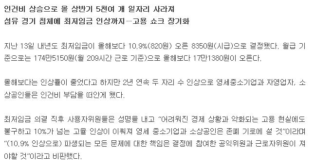 ÀΰǺñ »ó½ÂÀ¸·Î ¿Ã »ó¹Ý±â 5õ¿© °³ ÀÏÀÚ¸® »ç¶óÁ®¼¶À¯ °æ±â ħü¿¡ ÃÖÀúÀÓ±Ý Àλó±îÁö¡¦°í¿ë ¼îÅ© Àå±âÈÁö³ 13ÀÏ ³»³âµµ ÃÖÀúÀÓ±ÝÀÌ ¿ÃÇØº¸´Ù 10.9%(820¿ø) ¿À¸¥ 8350¿ø(½Ã±Þ)À¸·Î °áÁ¤µÆ´Ù. ¿ù±Þ ±âÁØÀ¸·Î´Â 174¸¸5150¿ø(¿ù 209½Ã°£ ±Ù·Î ±âÁØ)À¸·Î ¿ÃÇØº¸´Ù 17¸¸1380¿øÀÌ ¿À¸¥´Ù.¿ÃÇØº¸´Ù´Â Àλó·üÀÌ ÁÙ¾ú´Ù°í ÇÏÁö¸¸..
