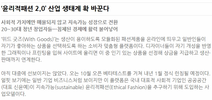 »çȸÀû °¡Ä¡¿¡¸¸ ¸Å¸ôµÇÁö ¾Ê°í Áö¼Ó°¡´É ¼ºÀåÀ¸·Î Àüȯ 20~30´ë û³â â¾÷Àڵ顦ħüµÈ °æÁ¦¿¡ Ȱ·Â ºÒ¾î³Ö¾î¡®À§µå ±ÂÁî(With Goods)¡¯´Â »ý»êÀÌ ¿ëÀÌÇϵµ·Ï ¸ðµâÈµÈ ÆÐ¼ÇÁ¦Ç°À» ¿Â¶óÀο¡ ¶ç¿ì°í ÀϹÝÀεéÀÌ ÀڱⰡ ÁÁ¾ÆÇÏ´Â »óǰÀ» ¼±ÅÃÇϵµ·Ï ÇÏ´Â ¼ÒºñÀÚ ¸ÂÃãÇü Ç÷§ÆûÀÌ´Ù. µðÀÚÀ̳ʵéÀÌ Àڱ⠰³¼ºÀ» ¹Ý¿µÇÑ ±×·¡ÇÈ..