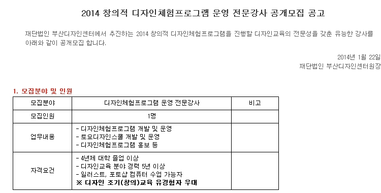 Àç´Ü¹ýÀÎ ºÎ»êµðÀÚÀμ¾ÅÍ¿¡¼ ÃßÁøÇÏ´Â 2014 âÀÇÀû µðÀÚÀÎüÇèÇÁ·Î±×·¥À» ÁøÇàÇÒ µðÀÚÀα³À°ÀÇ Àü¹®¼ºÀ» °®Ãá À¯´ÉÇÑ °»ç¸¦ ¾Æ·¡¿Í °°ÀÌ °ø°³¸ðÁý ÇÕ´Ï´Ù.