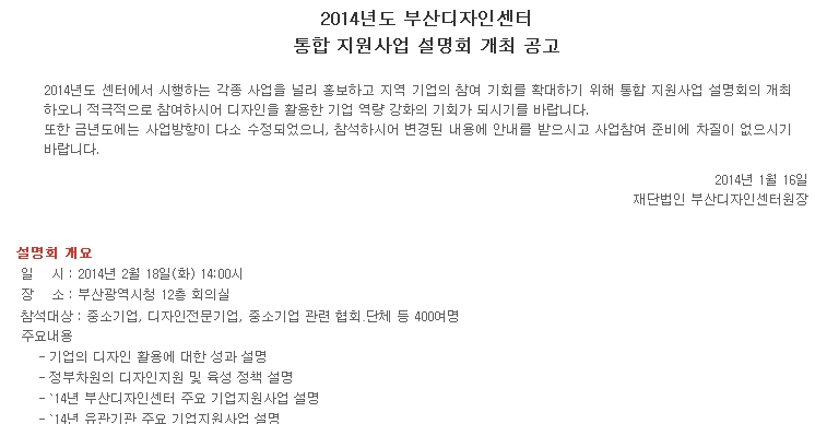 2014³âµµ ºÎ»êµðÀÚÀμ¾ÅÍ ÅëÇÕ Áö¿ø»ç¾÷ ¼³¸íȸ °³ÃÖ °ø°í