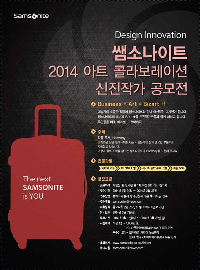 ¡ã © KoreaFashionNews¼¼°èÀûÀÎ ¶óÀÌÇÁ½ºÅ¸ÀÏ ºê·£µå ½Ü¼Ò³ªÀÌÆ®(Samsonite)¿¡¼ 2014³â ¾ÆÆ® Äݶ󺸷¹À̼ÇÀ» À§ÇÑ ½ÅÁøÀÛ°¡ °ø¸ðÀüÀ» ÁøÇàÇÑ´Ù.½Ü¼Ò³ªÀÌÆ®´Â 2011³âºÎÅÍ ¸ÅÇØ ¹èº´¿ì, ÀÌ¿ë¹é, ȲÁÖ¸® ÀÛ°¡¿Í ¾ÆÆ® ..