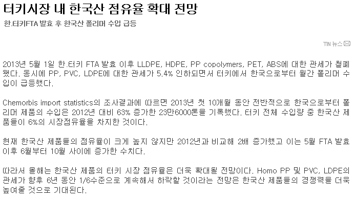 2013³â 5¿ù 1ÀÏ ÇÑ․ÅÍŰ FTA ¹ßÈ¿ ÀÌÈÄ LLDPE, HDPE, PP copolymers, PET, ABS¿¡ ´ëÇÑ °ü¼¼°¡ öÆóµÆ´Ù. µ¿½Ã¿¡ PP, PVC, LDPE¿¡ ´ëÇÑ °ü¼¼°¡ 5.4% ÀÎÇÏµÇ¸é¼ ÅÍŰ¿¡¼ Çѱ¹À¸·ÎºÎÅÍ ¿ù°£ Æú¸®¸Ó ¼öÀÔÀÌ ±ÞµîÇß´Ù.