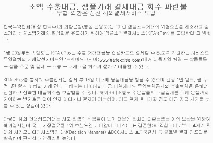 Çѱ¹¹«¿ªÇùȸ(ȸÀå ÇÑ´ö¼ö)¿Í ¿ÜȯÀºÇà(ÇàÀå À±¿ë·Î)Àº ¡°ÀÌ·± »ùÇüҾװŷ¡ÀÇ À§Çè¿äÀθ¦ ÇØ¼ÒÇϰí Áß¼Ò±â¾÷ »ùÇüҾװŷ¡ÀÇ È°¼ºÈ¸¦ À¯µµÇϱâ À§ÇÏ¿©¡®»ùÇüҾװáÁ¦¼ºñ½º(KITA ePay)¡¯¸¦ µµÀÔÇÑ´Ù¡±°í ¹àÇû´Ù.