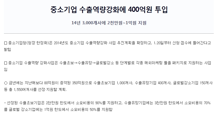 14³â 3,000°³»ç¿¡ 2õ¸¸¿ø~1¾ï¿ø Áö¿ø ¡à Áß¼Ò±â¾÷û(ûÀå ÇÑÁ¤È)Àº 2014³âµµ Áß¼Ò±â¾÷ ¼öÃ⿪·®°È »ç¾÷ ÃßÁø°èȹÀ» È®Á¤Çϰí, 1.20ÀϺÎÅÍ ½Åû¡¤Á¢¼ö¿¡ µé¾î°£´Ù°í ¹àÈû¡à Áß¼Ò±â¾÷ ¼öÃ⿪·® °È»ç¾÷Àº ¼öÃâÃʺ¸¡æ¼öÃâÀ¯..