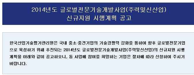 2014³âµµ ±Û·Î¹úÀü¹®±â¼ú°³¹ß»ç¾÷ ½Å±ÔÁö¿ø ½ÃÇà°èȹ °ø°í