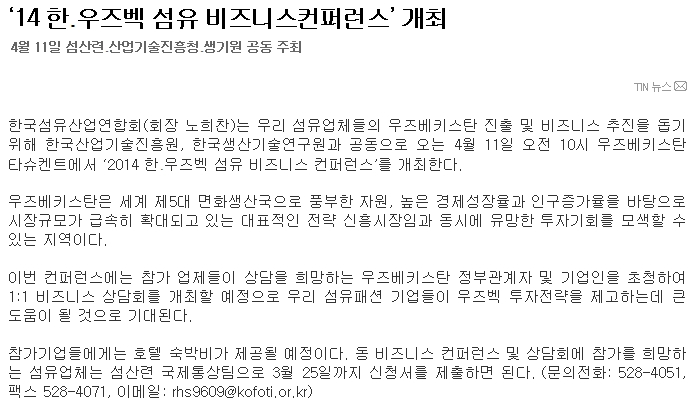 Çѱ¹¼¶À¯»ê¾÷¿¬ÇÕȸ(ȸÀå ³ëÈñÂù)´Â ¿ì¸® ¼¶À¯¾÷üµéÀÇ ¿ìÁŰ½ºÅº ÁøÃâ ¹× ºñÁî´Ï½º ÃßÁøÀ» µ½±â À§ÇØ Çѱ¹»ê¾÷±â¼úÁøÈï¿ø, Çѱ¹»ý»ê±â¼ú¿¬±¸¿ø°ú °øµ¿À¸·Î ¿À´Â 4¿ù 11ÀÏ ¿ÀÀü 10½Ã ¿ìÁŰ½ºÅº Ÿ½´ÄËÆ®¿¡¼ ¡®2014 ÇÑ․¿ìÁ ¼¶À¯ ºñÁî´Ï½º ÄÁÆÛ·±½º¡¯¸¦ °³ÃÖÇÑ´Ù.