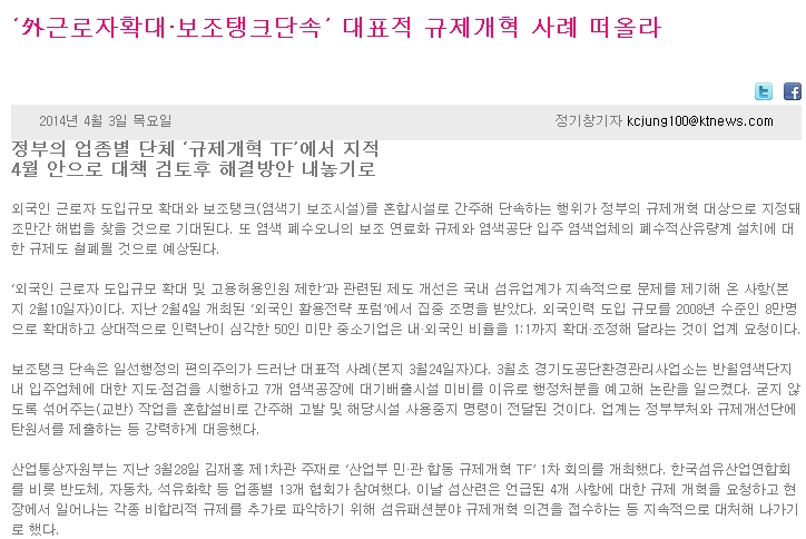 Á¤ºÎÀÇ ¾÷Á¾º° ´Üü ¡®±ÔÁ¦°³Çõ TF¡¯¿¡¼ ÁöÀû4¿ù ¾ÈÀ¸·Î ´ëÃ¥ °ËÅäÈÄ ÇØ°á¹æ¾È ³»³õ±â·Î¿Ü±¹ÀÎ ±Ù·ÎÀÚ µµÀÔ±Ô¸ð È®´ë¿Í º¸Á¶ÅÊÅ©(¿°»ö±â º¸Á¶½Ã¼³)¸¦ È¥Çսü³·Î °£ÁÖÇØ ´Ü¼ÓÇÏ´Â ÇàÀ§°¡ Á¤ºÎÀÇ ±ÔÁ¦°³Çõ ´ë»óÀ¸·Î ÁöÁ¤µÅ Á¶¸¸°£ ÇØ¹ýÀ» ãÀ» °ÍÀ¸·Î ±â´ëµÈ´Ù. ¶Ç ¿°»ö Æó¼ö¿À´ÏÀÇ º¸Á¶ ¿¬·áÈ ±ÔÁ¦¿Í ¿°»ö°ø´Ü ÀÔÁÖ ¿°»ö..