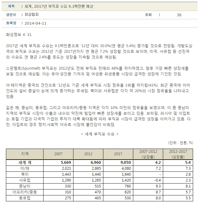 2017³â ¼¼°è ºÎÁ÷Æ÷ ¼ö¿ä´Â 9.1¹é¸¸ÅæÀ¸·Î ¡®12³â ´ëºñ 30.0%(¿¬ Æò±Õ 5.4%) Áõ°¡ÇÒ °ÍÀ¸·Î Àü¸ÁµÊ. °³¹ßµµ»ó±¹ÀÇ ºÎÁ÷Æ÷ ¼ö¿ä´Â 2012³â ±âÁØ 2017³â±îÁö ¿¬ Æò±Õ 7.2% ¼ºÀåÇÒ °ÍÀ¸·Î º¸À̸ç, ¹Ì±¹, ¼À¯·´ µî ¼±Áø±¹ÀÇ ¼ö¿äµµ ¿¬ Æò±Õ 2.4%¸¦ ¿ôµµ´Â ¼ºÀåÀ» Áö¼ÓÇÒ °ÍÀ¸·Î ¿¹»óµÊ. ½ºÆÝ¸áÆ®(Spunmelt) ºÎÁ÷Æ÷´Â 2012³âµµ ..