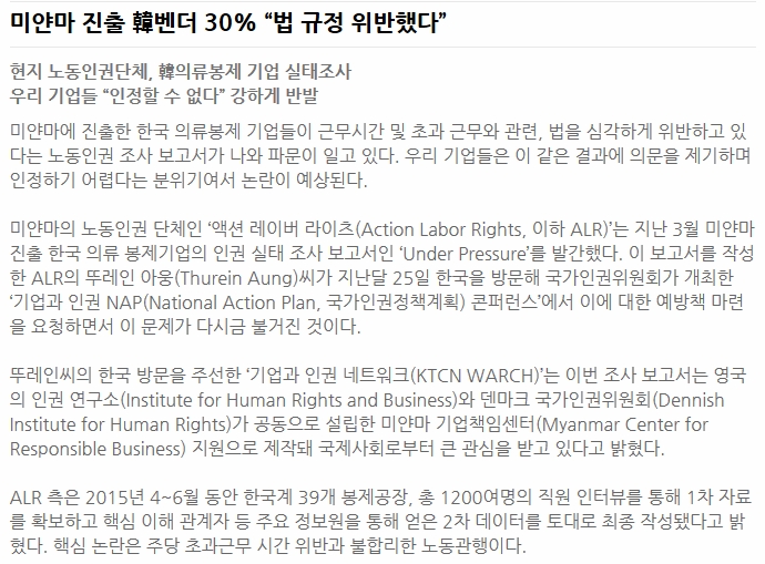 ÇöÁö ³ëµ¿ÀαǴÜü, ùÛÀÇ·ùºÀÁ¦ ±â¾÷ ½ÇÅÂÁ¶»ç ¿ì¸® ±â¾÷µé ¡°ÀÎÁ¤ÇÒ ¼ö ¾ø´Ù¡± °ÇÏ°Ô ¹Ý¹ß¹Ì¾á¸¶¿¡ ÁøÃâÇÑ Çѱ¹ ÀÇ·ùºÀÁ¦ ±â¾÷µéÀÌ ±Ù¹«½Ã°£ ¹× Ãʰú ±Ù¹«¿Í °ü·Ã, ¹ýÀ» ½É°¢ÇÏ°Ô À§¹ÝÇϰí ÀÖ´Ù´Â ³ëµ¿À뱂 Á¶»ç º¸°í¼°¡ ³ª¿Í ÆÄ¹®ÀÌ Àϰí ÀÖ´Ù. ¿ì¸® ±â¾÷µéÀº ÀÌ °°Àº °á°ú¿¡ Àǹ®À» Á¦±âÇϸç ÀÎÁ¤ÇÏ±â ¾î·Æ´Ù..