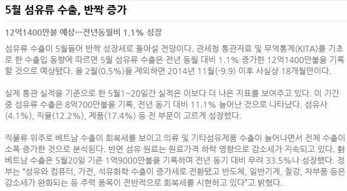12¾ï1400¸¸ºÒ ¿¹»ó¡¦Àü³âµ¿¿ùºñ 1.1% ¼ºÀå¼¶À¯·ù ¼öÃâÀÌ 5¿ùµé¾î ¹Ý¦ ¼ºÀå¼¼·Î µ¹¾Æ¼³ Àü¸ÁÀÌ´Ù. °ü¼¼Ã» Åë°üÀÚ·á ¹× ¹«¿ªÅë°è(KITA)¸¦ ±âÃÊ·Î ÇÑ ¼öÃâÀÔ µ¿Çâ¿¡ µû¸£¸é 5¿ù ¼¶À¯·ù ¼öÃâÀº Àü³â µ¿¿ù ´ëºñ 1.1% Áõ°¡ÇÑ 12¾ï1400¸¸ºÒÀ» ±â·ÏÇÒ °ÍÀ¸·Î ¿¹»óµÆ´Ù. ¿Ã 2¿ù(0.5%)À» Á¦¿ÜÇϸé 2014³â 11¿ù(-9.9) ÀÌÈÄ »ç½Ç»ó 18..