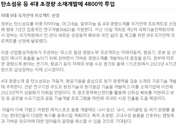 ¹Ì·¡ 9´ë ±¹°¡Àü·« ÇÁ·ÎÁ§Æ® ¼±Á¤Á¤ºÎ´Â ź¼Ò¼¶À¯¸¦ ºñ·Ô ŸÀÌŸ´½, ¸¶±×³×½·, ¾Ë·ç¹Ì´½ µî 4´ë °æ·®¼ÒÀ縦 ±¹°¡Àü·« ÇÁ·ÎÁ§Æ®·Î ¼±Á¤ÇØ ÇâÈÄ 7³â°£ ÁýÁßÀûÀÎ ¿¬±¸°³¹ß(R&D)À» Áö¿øÇÑ´Ù. Áö³ 10ÀÏ °³ÃÖµÈ Á¦2Â÷ °úÇбâ¼úÀü·«È¸ÀÇ¿¡¼ Á¤ºÎ´Â ±¹°¡Â÷¿ø¿¡¼ ¹Î¡¤°üÀÇ »õ·Î¿î ¼ºÀ嵿·Â È®º¸¿Í ±¹¹Î »îÀÇ Áú Á¦°í¸¦ À§ÇÑ 9..