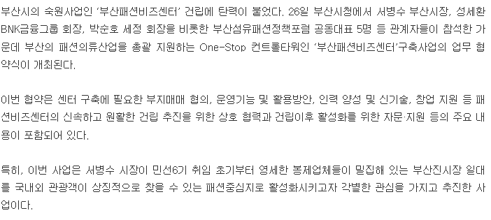 ºÎ»ê½ÃÀÇ ¼÷¿ø»ç¾÷ÀÎ ¡®ºÎ»êÆÐ¼ÇºñÁî¼¾ÅÍ¡¯ °Ç¸³¿¡ ź·ÂÀÌ ºÙ¾ú´Ù. 26ÀÏ ºÎ»ê½Ãû¿¡¼ ¼º´¼ö ºÎ»ê½ÃÀå, ¼º¼¼È¯ BNK±ÝÀ¶±×·ì ȸÀå, ¹Ú¼øÈ£ ¼¼Á¤ ȸÀåÀ» ºñ·ÔÇÑ ºÎ»ê¼¶À¯ÆÐ¼ÇÁ¤Ã¥Æ÷·³ °øµ¿´ëÇ¥ 5¸í µî °ü°èÀÚµéÀÌ Âü¼®ÇÑ °¡¿îµ¥ ºÎ»êÀÇ ÆÐ¼ÇÀÇ·ù»ê¾÷À» ÃѰý Áö¿øÇÏ´Â One-Stop ÄÁÆ®·ÑŸ¿öÀÎ ¡®ºÎ»êÆÐ¼ÇºñÁî¼¾ÅÍ¡¯±¸Ãà»ç¾÷ÀÇ ..